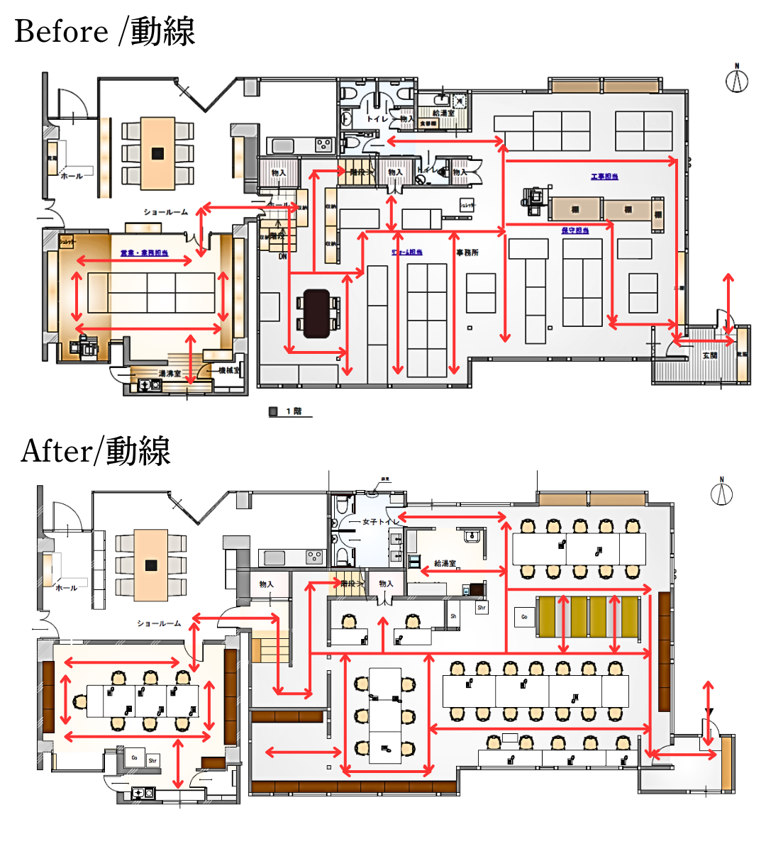 ホーム 施工事例 リニューアル オフィス 1Fオフィス 1Fオフィス 五感が整う、心地よいフリーアドレス空間に リニューアル|オフィス オフィス1Fをフリーアドレス席と固定席にリニューアル致しました。 毎日好きな席で仕事をすることができ、社員同士コミュニケーションの促進化につながっています。 画像のみを表示全 9 枚中 1 枚目を表示Next ≫ 動線の変化 改装前は通路が狭く、一方通行で誰かが通りすぎるのを待つ場面がしばしば見られました。女性社員が増えているなか、男子トイレと隣接していることやレイアウトが悪いことからフリーアドレス化に。改装後はどこを通っても人一人が余裕をもって通れるようになり、ストレスフリーになりました。 画像のみを表示全 9 枚中 2 枚目を表示≪ Prev|Next ≫ ソファ席 以前は押し入れだったスペースがソファ席になりました。 打合せをしたり、お昼ご飯を食べたり、図面を広げて作業をしたりなど様々な用途で使用しています。画像のみを表示全 9 枚中 3 枚目を表示≪ Prev|Next ≫ グリーン ~視覚~ フリーアドレス化に伴い個人の荷物はロッカーに入れて管理しています。 誰がどこに座ってもフェイクグリーンが見えるよう配置することを意識し、配置場所の一つにロッカーの上を選びました。 奥側から乾燥地帯植物、湿地帯植物、熱帯系植物のグラデーション状に変化づけて配置しています。 画像のみを表示全 9 枚中 4 枚目を表示≪ Prev|Next ≫ グリーン 既存の大きな開口窓を利用し、自然光を取り入れた席となります。 リラックス効果や疲労回復効果も期待し窓側にグリーンを設けました。画像のみを表示全 9 枚中 5 枚目を表示≪ Prev|Next ≫ グリーン ~視覚~ 壁が厚く大きな窓は鉢を平置きすると高さが余ります。この特徴を活かすため、シダ植物やツル植物、縦長のポットを用いて視線の抜けを確保しつつ、縦方向への広がりを演出しました。 画像のみを表示全 9 枚中 6 枚目を表示≪ Prev|Next ≫ 音響 ~聴覚~ KOKUYOさんのサウンドマスキングを導入しました。 以前はオフィス内が静まり返った空間であった為遠くで話している方の声が響き渡り、どこか話しづらいような空気感がありましたが空調音のような背景音や鳥や波の音をわざと部屋に流すことで、遠くからの小さな音を聞こえなく(マスク)し、話しやすい空気感、癒し効果もあり居心地がよく仕事がよりしやすいオフィスになりました。画像のみを表示全 9 枚中 7 枚目を表示≪ Prev|Next ≫ ソファ席から見たフリーアドレス席、奥側は固定席になります。 画像のみを表示全 9 枚中 8 枚目を表示≪ Prev|Next ≫ 各部署のリーダー席をあえてまとめました。 上層部が打合せや悩みなどを抱え込まず相談しやすい環境を作り仕事の生産性をあげるように配置しました。画像のみを表示全 9 枚中 9 枚目を表示≪ Prev 一覧へ戻る タイプ別にみる リニューアル すべて 戸建てリフォーム マンションリフォーム オフィス